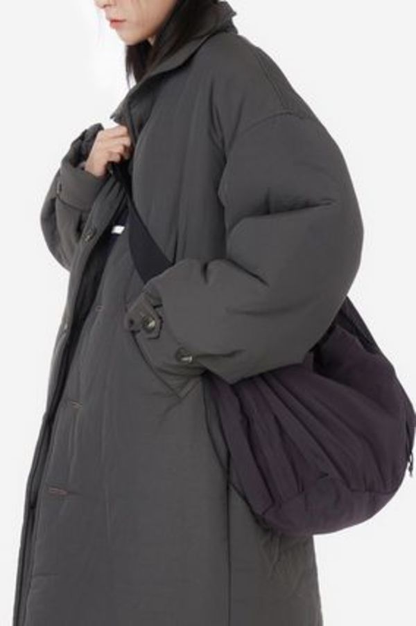 ドローストリング(巾着)タイプのショルダーバッグは、ルーズなシルエットが特徴。同じくストリートな装いと相性が良いのでオーバーサイズのコーデを組むのがおすすめです。