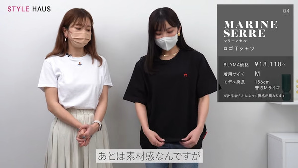 続いてご紹介するのは「マリーンセル」のロゴTシャツです。エッジの効いたデザインが特徴で、一部の方にはハードルが高く感じられるかもしれませんが、このTシャツは取り入れやすいデザインです。私がMサイズを着用していますが、結構オーバーサイズな印象です。もう少しピッタリ目に着たい方は、小さめのサイズを選ぶのがおすすめです。素材感については、しっかりとした厚みがあり、生地もしっかりとしていますので長くご使用いただけると思います。