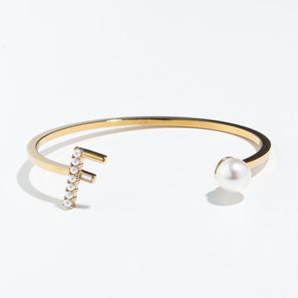 フェンディファーストロゴをあしらった華奢なバングルは、クリスタルとビジューパールの装飾がエレガント。細身なのでスーツスタイルにも合わせやすく、お仕事コーデにも馴染みます。
