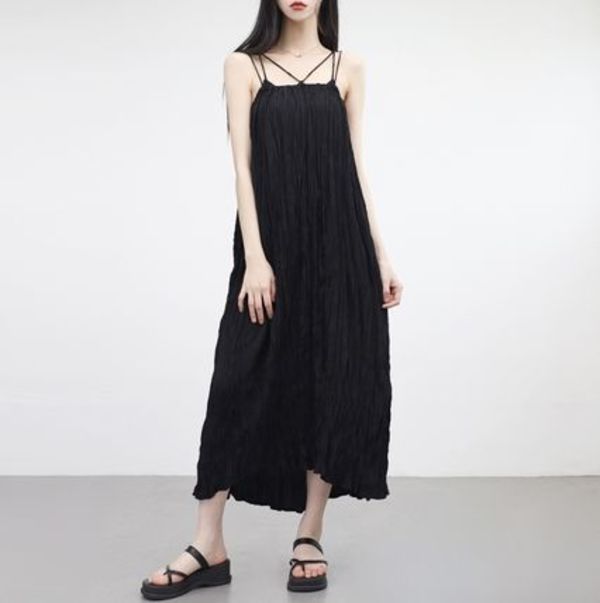 数本のストラップが重なったデザインのワンピースはデコルテがきれいに見えます。タンクトップをレイヤードして、よりおしゃれな着こなしに。