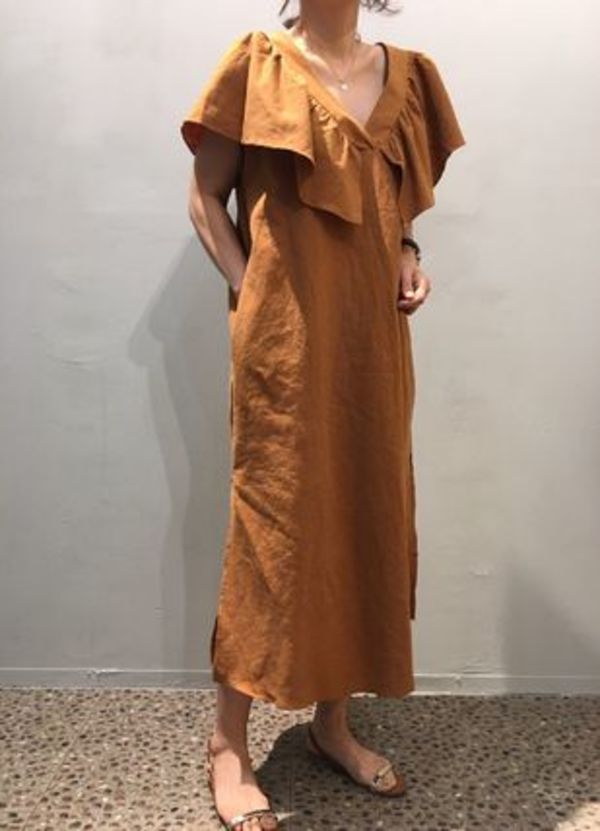襟元にインパクトがあり、一枚でコーデを完成させてくれるワンピース。二の腕も隠れていてゆったりシルエットなので、ボディーラインも気になりません。