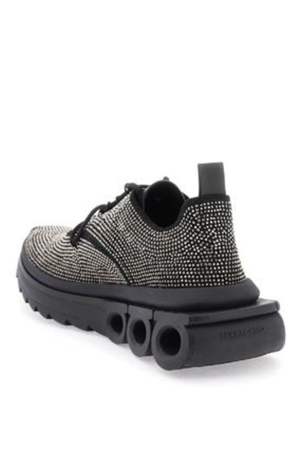 フェラガモお馴染みとなるアイコンのガンチーニが上手く配列されたニットスニーカーはソールのデザインが最大の注目ポイント。浅めのシャークソールにトレンドの厚底ソールが使われ、またソールのヒールカットはスクエアとなっております。