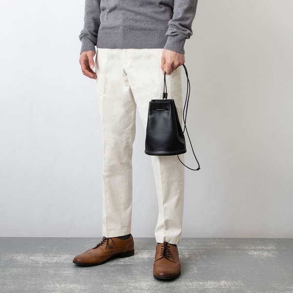 ▼この巾着スタイルのバッグ、メンズではかなり珍しいデザインとなります。ジルサンダー好きのコーデはシンプルかつモードなスタイルが多いので、そんな着こなしにベストマッチするアイテム。