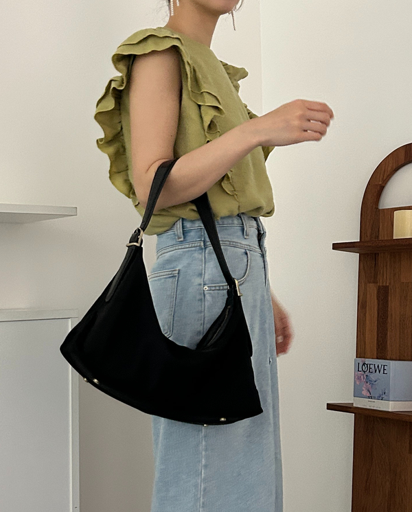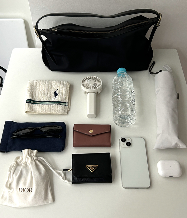 500mlペットボトルに加え、iPadや折り畳み傘なども一気にまとめられる大容量バッグ♡ストラップが短めだからこそ、大きめバッグでも野暮ったくならずスッキリとした印象に。ナイロン素材ながら大人カラーでカジュアル過ぎないところがおすすめです。