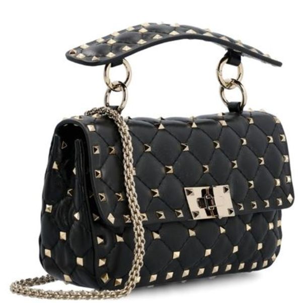 ナッパレザーのキルティングディテールとプラチナ仕上げのスタッズが施された「ロックスタッズ」スモールバッグ。取り外し可能なトップハンドルとスライド式チェーンにより、ハンドバッグ、ショルダーバッグ、クロスボディバッグと3WAYで使えます。