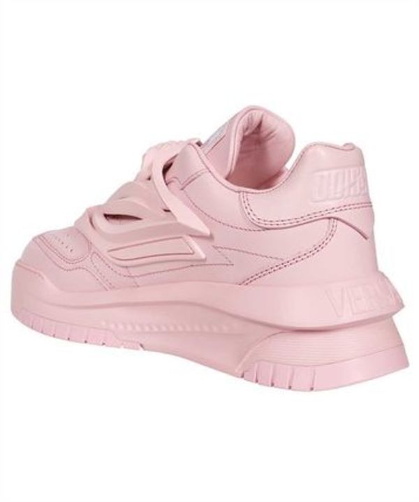 ボディからソールまで、すべてピンクで統一されたストリート感漂う「ODISSEA」。アッパーのシューレス部分には、メゾンの象徴であるメドゥーサが施されています。素材にはレザーが贅沢に使用され、後ろにはロゴが刻まれた高級感ある仕上がりです。
