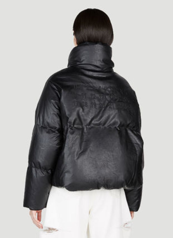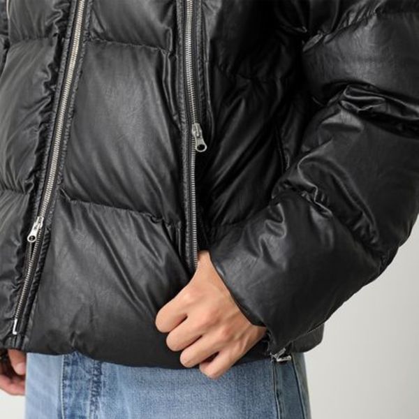 レザー風生地のダウンジャケットは、背中に施されたナンバリングロゴがアイコニック。スタイルアップ効果抜群のクロップド丈やハイネック、ニットカフス付きの長い袖など、随所にこだわりが感じられます。