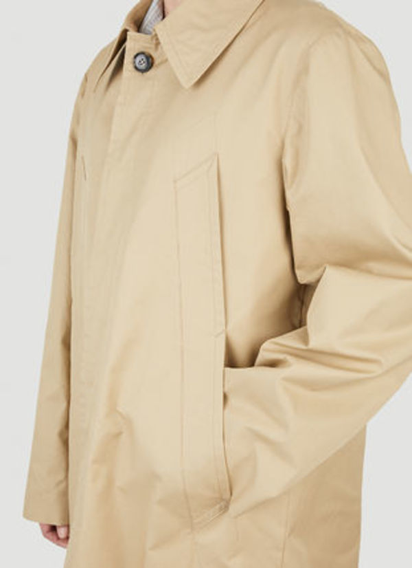 ニーレングスで長めのトレンチコートは、ボタンが見えない比翼仕立てがすっきりとミニマルな印象。一見シンプルながらも前身頃には2つに仕切られた細長いポケットが施され、特別感のある印象を与えてくれます。