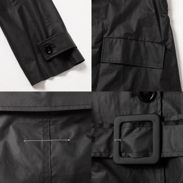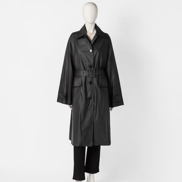 やや裾に向けて広がるAラインのシルエットが特徴的なオーバーサイズのトレンチコート。共布のベルトが付属し、ウエストをシェイプしてシルエットの印象を変えることも可能。ぬめ感のあるコーテッドコットン素材が遊び心をプラスします。