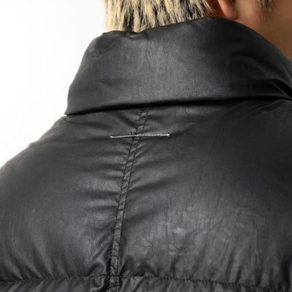 艶感のあるマットな人工皮革を使用したダウンジャケットは、内側が2つに区切られた細長いジップポケットが面白いアクセントに。バックにはブランドを象徴するホワイトステッチがあしらわれています。