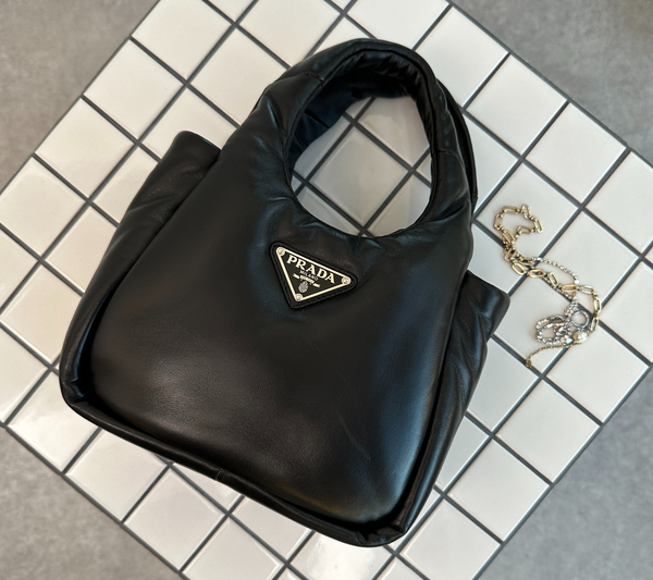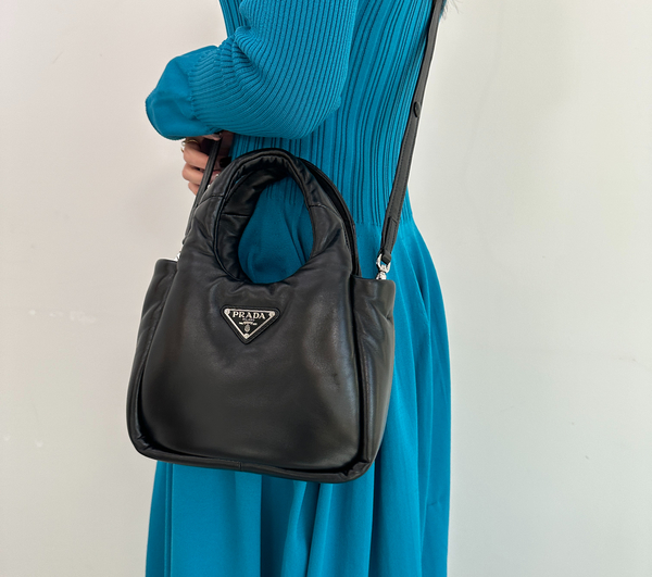 ダウンバッグの大本命はPRADA(プラダ)。こちらのパデッドハンドバッグは、柔らかいナッパレザーが使用されたソフトな質感が特徴。中に仕切りがあり整理整頓しやすいほか、マグネット開閉や取り外し可能なショルダーストラップなど、見た目だけでない機能性にも注目です。