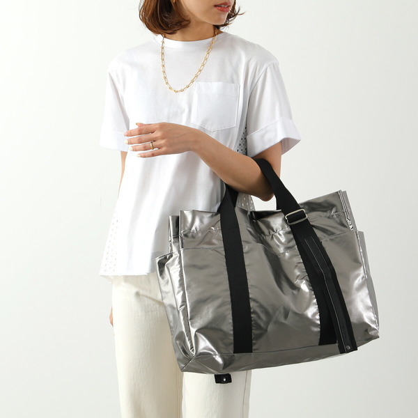 横42cm×縦39.5cm×マチ11.5cmの超軽量トートバッグ。防水・耐久性・撥水加工も施された生地のため、アウトドアにも使える一品。外側フロントにオープンポケット×3、両サイドにオープンポケット×2と全部で5つ。長さ調節可能なベルト仕様の持ち手にもなっているため、シーンによってハンドバッグ、トートバッグの使い分けもできます。