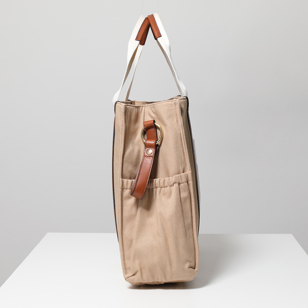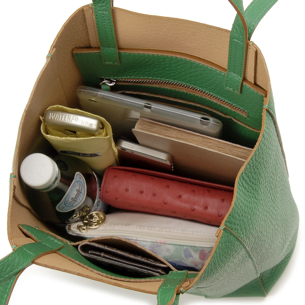 A4収納不可であるものの、横25cm×縦33cm×マチ10cmとスリムな縦長シェイプのトートバッグ。フロントにオープンポケット1つ、内部にもファスナーポケット×1、オープンポケット×2と仕分けて収納しやすく使い勝手抜群。ハンドルも2つ付いていてシーンに合わせて自由に使いこなすことができる仕様になっています。素材はコットン生地とレザー生地の2種類を展開中。