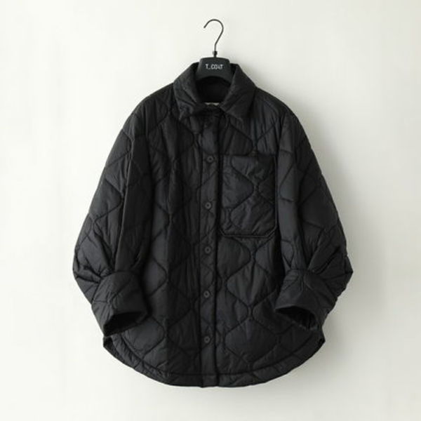T-COAT(ティーコート)のキルティングジャケットは、まるでシャツのような襟ぐりデザインがきっちりとした印象。バルーンパフスリーブとインナーを選ばないオーバーフィットで中に分厚いニットをインできて、寒い冬まで活躍。左胸の大きめポケットがアクセントをプラスします。