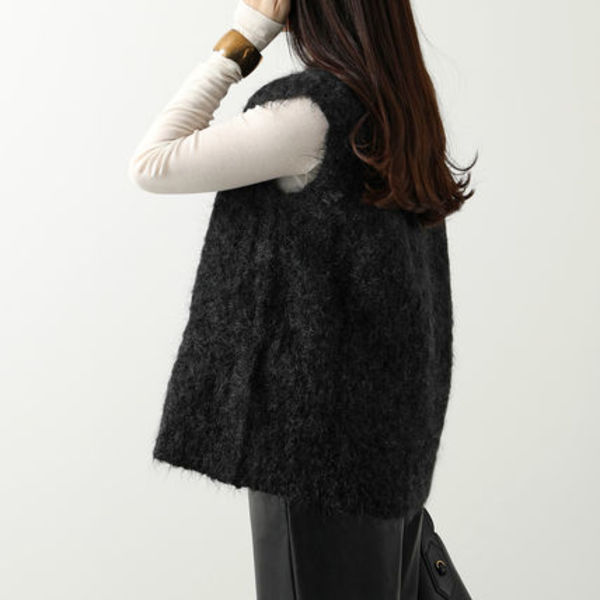 ニットベストは2023年秋冬のトレンドアイテムでもあり、2つ目にピックアップした薄手セーターや薄手のタートルカットソーにレイヤードするだけで、すぐさま洒落見え確実。S Max Mara(エスマックスマーラ)のモヘアジレは、長い毛足が特徴で、モードエレガントに決まる一着です。