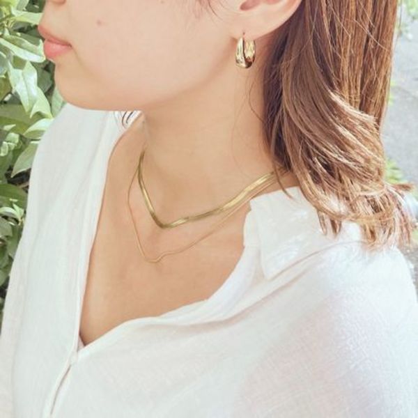 低刺激で耐久性のある18Kゴールドメッキチタンのヘリンボーンスネークチェーンが存在感を放つ、2連ネックレス。エレガントな雰囲気でパーティーシーンなど華やかな場面はもちろん、毎日のコーディネートにも使いやすい程よい存在感が魅力です。