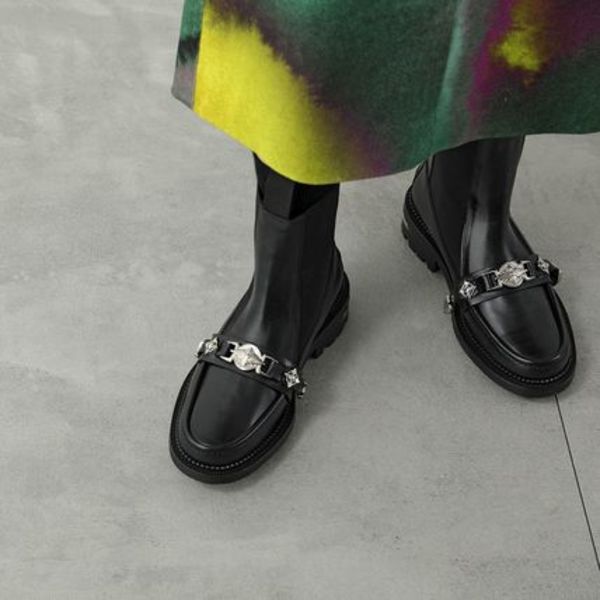 ローファースタイルのチェルシーブーツは、ブラックのシャイニーレザーが使用され高級感たっぷり。ラウンドトゥのアッパーにはロゴが刻印された大ぶりのゴールドメタルチェーンが施されています。