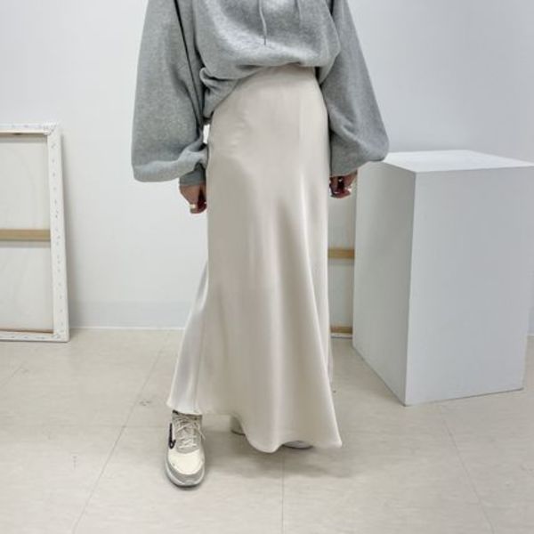 ボディラインを拾い過ぎずに縦長に見せてくれるサテンスカートは、ここ最近パンツやふんわりスカートばかり穿いていた人達にも取り入れやすいはず。脚を露出せずに、スッキリ細く見せてくれる頼れるアイテムです。