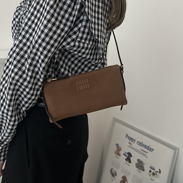 2026年は、コンパクトなポーチバッグがトレンド♡MiuMiu(ミュウミュウ)のミニポーチバッグは、コロンとしたブランドロゴがポイント!スマホやリップの入るサイズ感で、ちょっとしたお出かけに最適です。