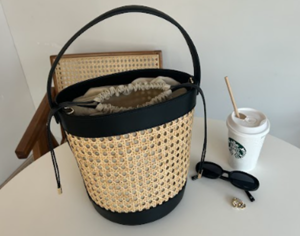 ∟バケット型のストローバッグは取り外し可能なショルダーストラップが付属している2WAY仕様。ドローストリング開閉式になっているためバッグのなかが丸見えになってしまう心配もなく、春先からエレガントに持ち歩くことができる人気デザインです。