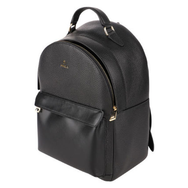 上質なカーフスキンを使用したフルラのリュックはコンパクトデザインが女性らしいアイテム。オールブラックですがハードになりすぎず、丸みのあるシルエットがフェミニンさをプラス!肩紐部分は穴あきベルトなので長さ調節も可能◎マチが15cmとたっぷりあり、見た目以上に収納力も抜群です。