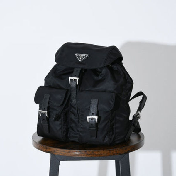 サスティナブル素材を使用したプラダのナイロンリュックは大人のリュックとして再注目されている人気アイテム。小ぶりな見た目ですが、500mlペットボトルが収まる実用的なサイズ感で収納力も◎。フラップに使われているレザーやプラダのロゴからハイブランドらしい高級感が感じられます。
