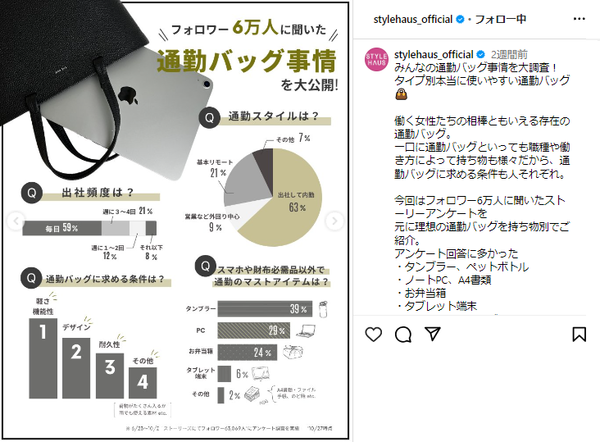 STYLE HAUS(スタイルハウス)編集部でSNSなどで独自にアンケートをとったところ、多くの働く女性はバッグに以下のモノを入れて持ち歩いてることが分かりました!!