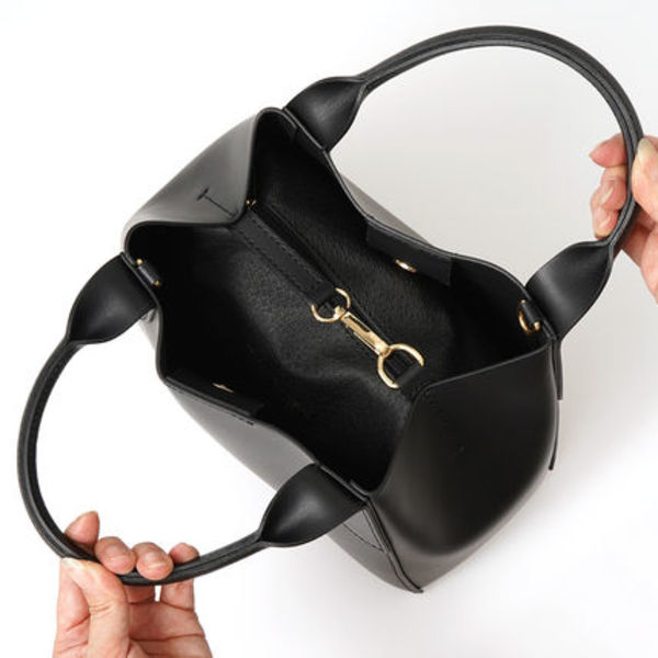 バッグの内側にフックが付いたバッグは、フックの開閉により2通りのバッグのフォルムを楽しめるアイテム。バッグの口がしっかりと閉まるわけではないので、ちょっとしたものを出し入れするのに便利なスタイルです。