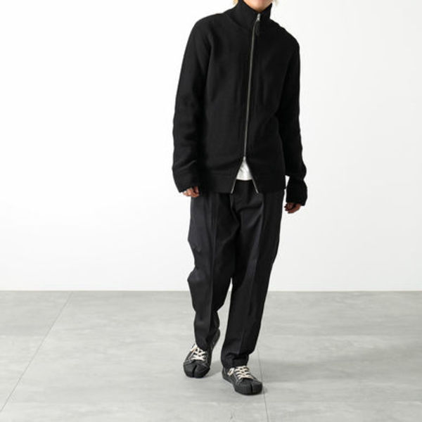 マルジェラのドライバーズニットは見た目でもわかる通り、かなり肉厚で縦ラインの印象が強めです。その印象を生かすべく、スラックス系のボトムスやテーパードパンツを合わせ、よりモードな着こなしを目指すのがオススメ。