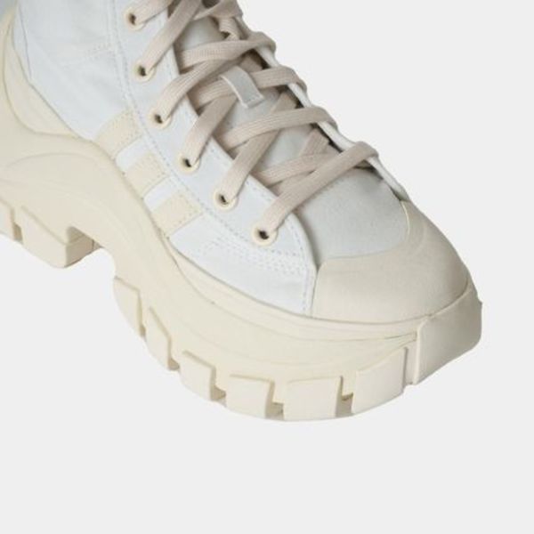 キャンバスの爽やかなアッパーに合わせた大胆なプラットフォームが特徴の厚底スニーカー「NIZZA HI」。ミッドカットでホールド力もあり、仕上げにはadidas(アディダス)のスリーストライプスがあしらわれました。