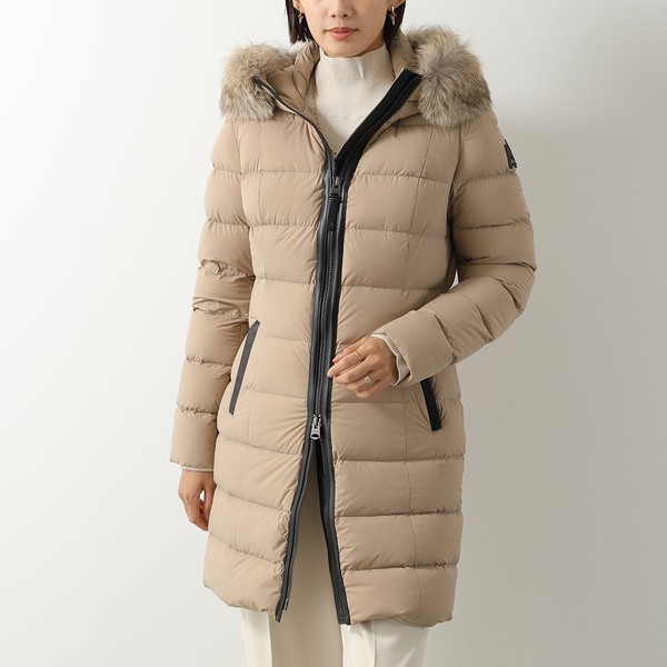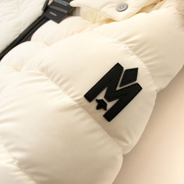 上質なダウンジャケットを象徴するMackage(マッカージュ)の「M」のロゴが存在感を放ちます。