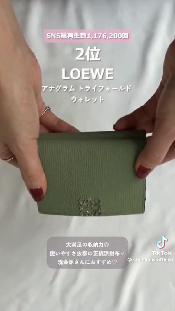 第2位はSNSでもよく見かける、LOEWE(ロエベ)アナグラム トライフォールド ウォレットがランクイン!総再生回数は約117万回
