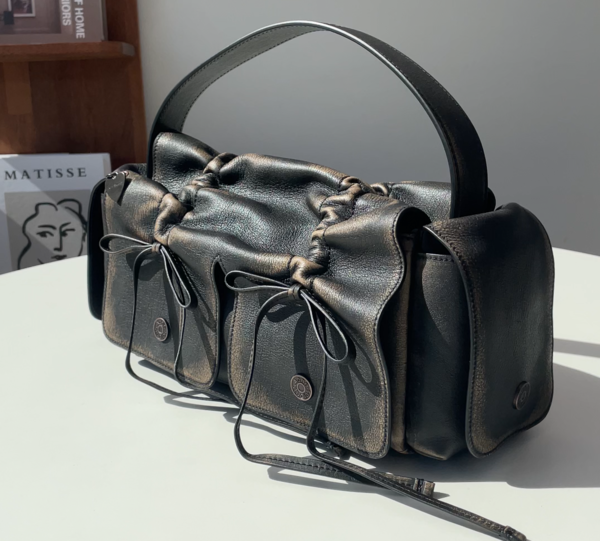 Acne Studios(アクネストゥディオス)のマルチポケットショルダーバッグは、シワ加工を施したかっこいいヴィンテージ風レザーとは対照的な、ギャザー仕上げとリボンディテールがポイント。収納力もたっぷりで、トップハンドルが付き2WAYで楽しめます。