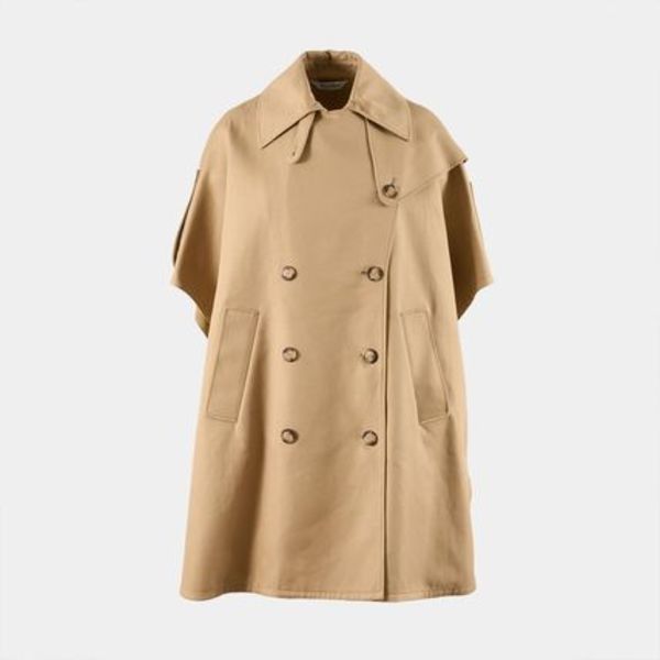 トレンチコートとケープを掛け合わせたデザインのアウター。 インナーを選ばないゆったりとしたスリーブに、両サイドはゴールドのチェーン付きのボタン付きで、エレガントなアクセントに。