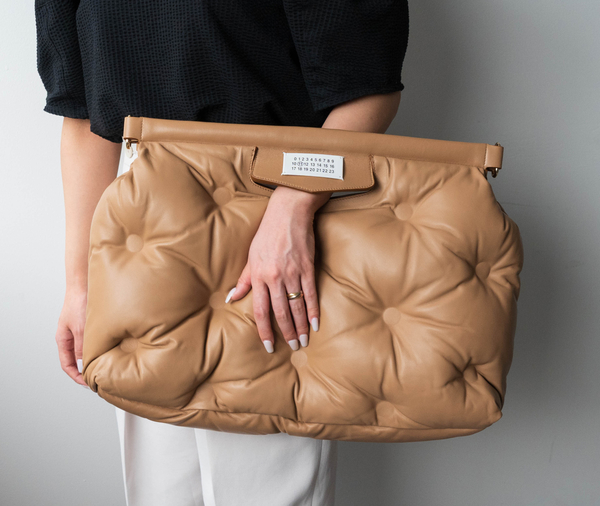 △ぷっくりとした『グラムスラム』は、マルジェラバッグの中でもインパクトのあるデザイン。ハンドバッグタイプは、ストラップも付いた2way仕様♡底鋲も付いているので、置いているときも美しい存在感を放ちます。