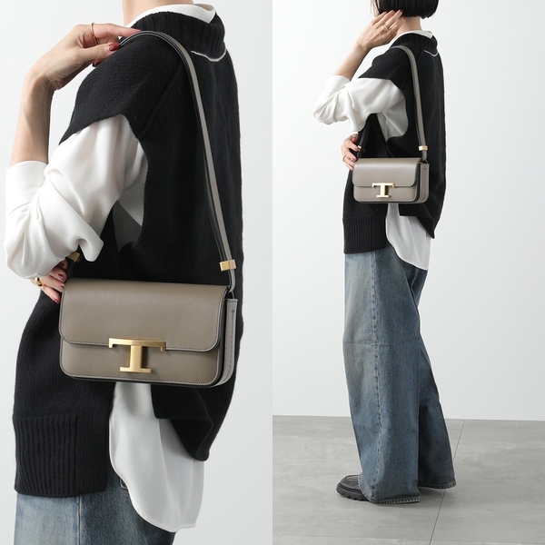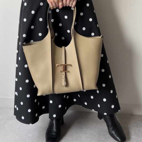 トッズのアイコンでもある“T タイムレス”のメタルペンダントを施した台形フォルムのレザーバッグ。コンパクトですが、横長なので意外と収納力がありデイリー使いに重宝します。取り外し・調節可能なストラップ付なので、さまざまな持ち方ができるところも◎
