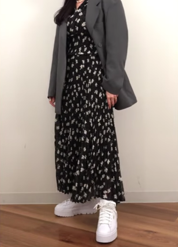 ミディアムスカートとの組み合わせでは、厚みのあるハイテクスニーカーやローカットスニーカーを合わせるとバランスよくまとまります。反対にボリューム感の少ないスニーカーを選ぶとふくらはぎの太さが強調されやすいので注意しましょう。
