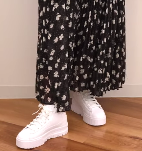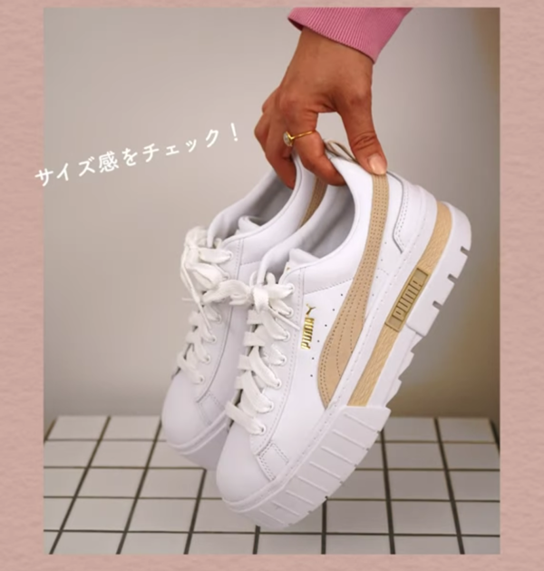 ご紹介したロングスカートにおすすめのスニーカーは、PUMA(プーマ)のMAYZE(メイズ)というモデル。人気のベージュカラーはカジュアルになり過ぎず、きれいめのコーデにも合わせやすいデザイン。厚底なので脚長効果もあり、Y2Kファッションにもおすすめの一足です。