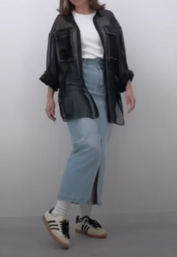 タイトなシルエットが綺麗なデニムスカートにスニーカーを合わせたコーデ。デニムスカートはスニーカーとの相性も良く、1年中履けるので1枚は持っていたいデイリーアイテム。