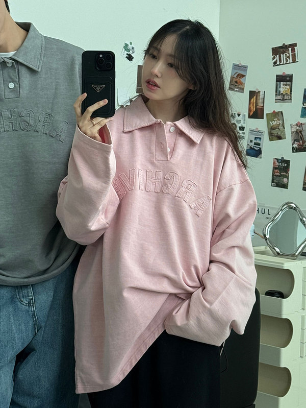 オーバーサイズのポロシャツなら彼との共有もOK。旬のムードのピンクカラーを選べばいつものデニムも一気に今っぽくなること間違いなし‼