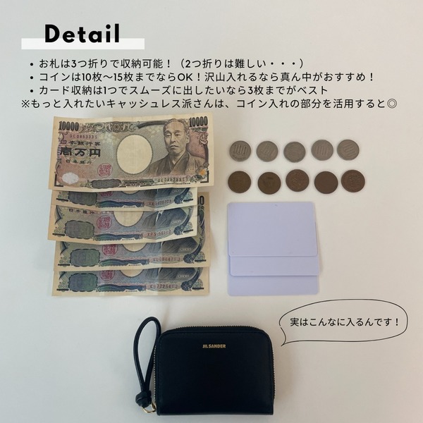 超コンパクトなサイズ感ながら、意外と収納力もかなり高め!3つ折りにすれば、お札もしっかりと収納できるため現金を持ち歩きたい人におすすめです。また、コインも10~15枚までなら入るため小銭がたくさんできてしまったときでも安心♡カードも3枚程度なら十分収まります。