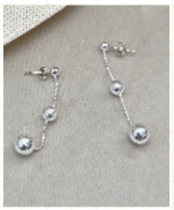 異なる大きさのシルバーボールが3つ連なったスイングピアスは、耳もとで揺れ動く姿がエレガント。カジュアルからきれいめスタイルまで多様な着こなしに映える一点です。
