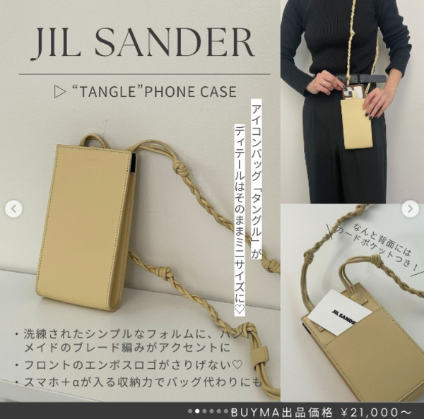 おしゃれさん御用達のイタリアブランドJil Sander(ジルサンダー)で愛されているアイコンバッグ、「タングル」のデザインが落とし込まれたフォンケースは隠れた名品。ノットが手作業であしらわれたブレード編みのストラップや、正面に刻まれたブランドロゴが洗練された印象をもたらしてくれます。