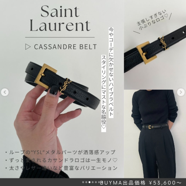 Saint Laurent(サンローラン)を象徴する“カサンドラ”ロゴのプレートが目を惹くレザーベルトは、思わず見せびらかしたくなるほどエレガント。流行りや年齢に左右されることなく使うことができ、デイリースタイルに投入するだけでおしゃれ賢者の着こなしへと昇華してくれる優れものです。