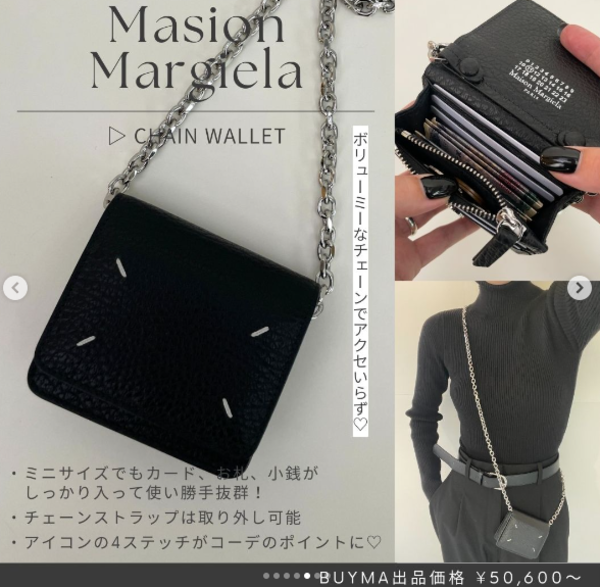 Maison Margiela(メゾンマルジェラ)の代名詞である“4ステッチ”が飾られたチェーンウォレットは、アクセサリー感覚で持ち歩きたくなるルックス。よこ10cm×たて9cm×マチ3cmのミニマルサイズながらも、内側には小銭入れと5つのカードスロットを備えている優等生です。