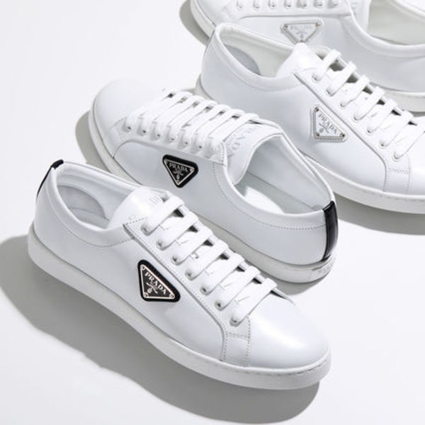 PRADA(プラダ)のレザースニーカーは、トライアングルのメタルロゴがモードな雰囲気を演出。真っ白なレザー素材が程よいツヤと品の良さを醸し出しています。スッキリとしたフォルムでスーツやジャケットスタイルとも好相性です。