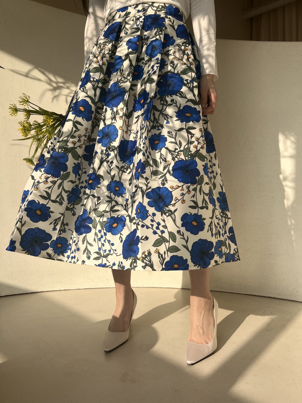 水彩画のような花柄がなんとも爽やかなスカート。ブルー×グリーンの配色がお洒落な1枚です。ふくらはぎが隠れるくらいのミディ丈で、暑い日や湿気が多日も快適に過ごせそう。