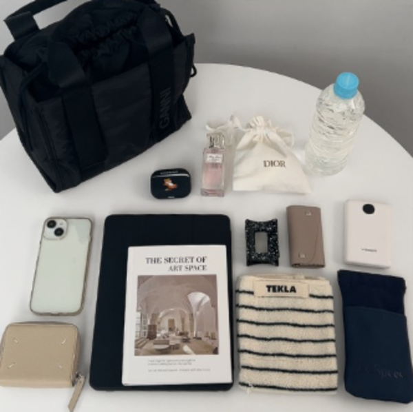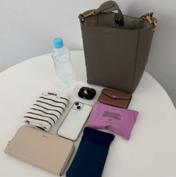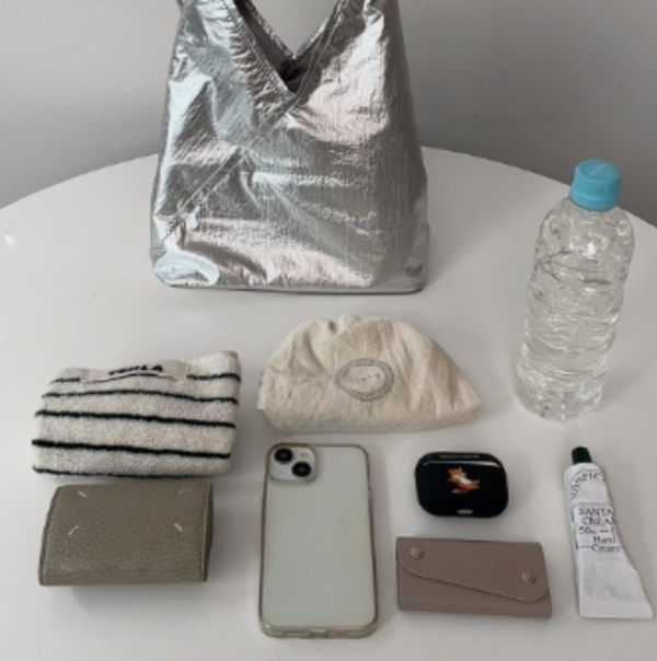 スマホ、ミニ財布、キーケース、AirPods、ポーチ、タオル、ハンドクリーム、500mlペットボトル