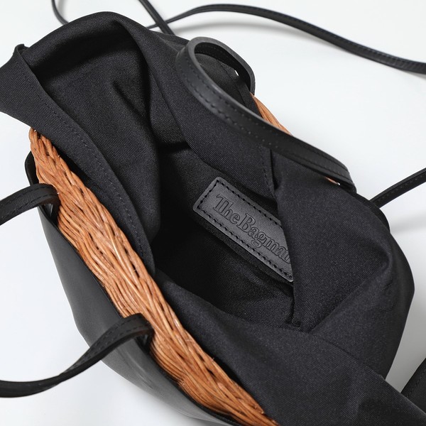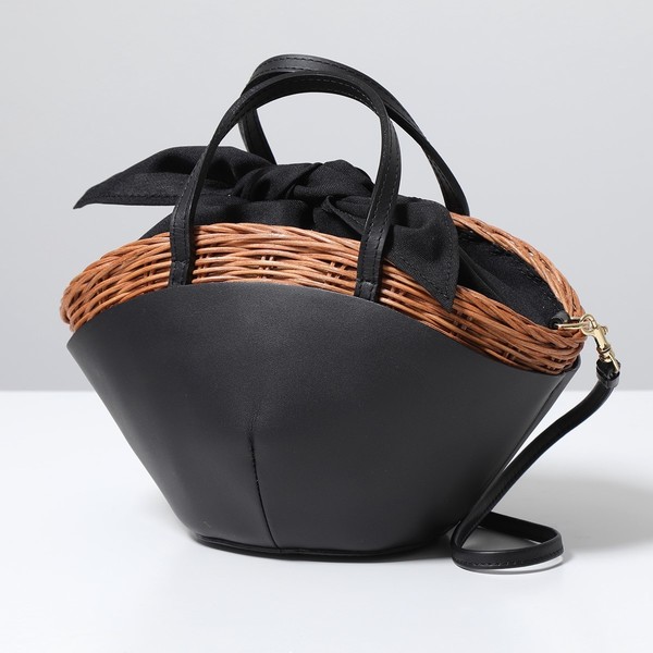 素朴なウィッカー(素編み)と都会的ムードのあるスムースレザー、ふんわりしたリボンの布地。異素材ミックスデザインがどこか温もりを感じるスモールサイズのかごバッグ。