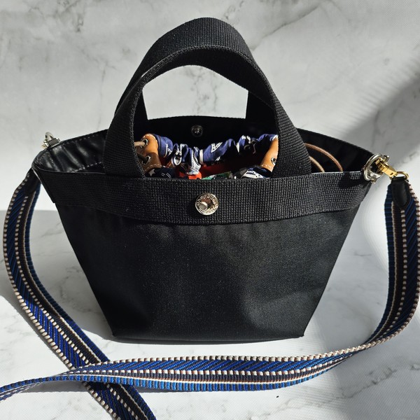 エルベシャプリエのこのバッグは、オープンバッグで中のモノを取り出しやすい反面、ジップで閉めたりできないため中身を落としてしまうという難点も…。そこで『フールビ』を仕込むことで、中身を巾着のようにきゅっと絞れて安心感UP!いざというときは絞って子どもを抱っこしたり遊んだりしています。(Yu)